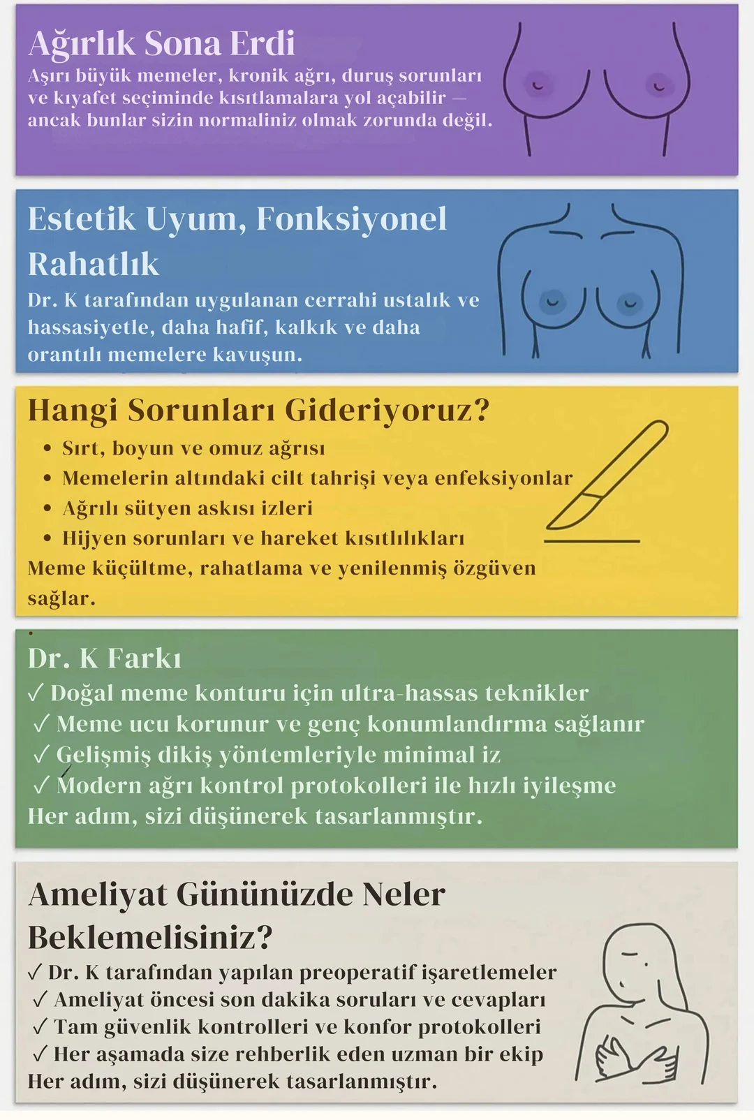 Dr. K, hem fonksiyonel hem de estetik hedeflerle meme küçültme gerçekleştirir. İşlem şunları kapsar: