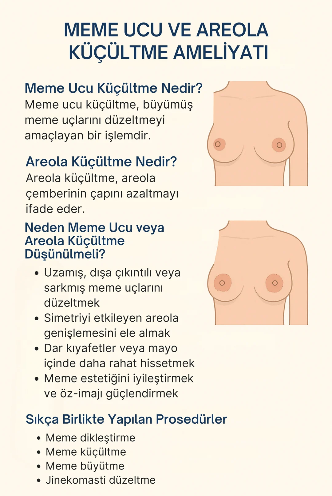 Areola küçültme, meme ucunu çevreleyen pigmente (renkli) dairesel alanın çapını azaltmayı hedefler. Amaç, daha iyi simetri, denge ve estetik uyum sağlamaktır. Bu işlem genellikle meme büyütme, dikleştirme veya küçültme gibi diğer göğüs operasyonlarıyla birlikte yapılır.