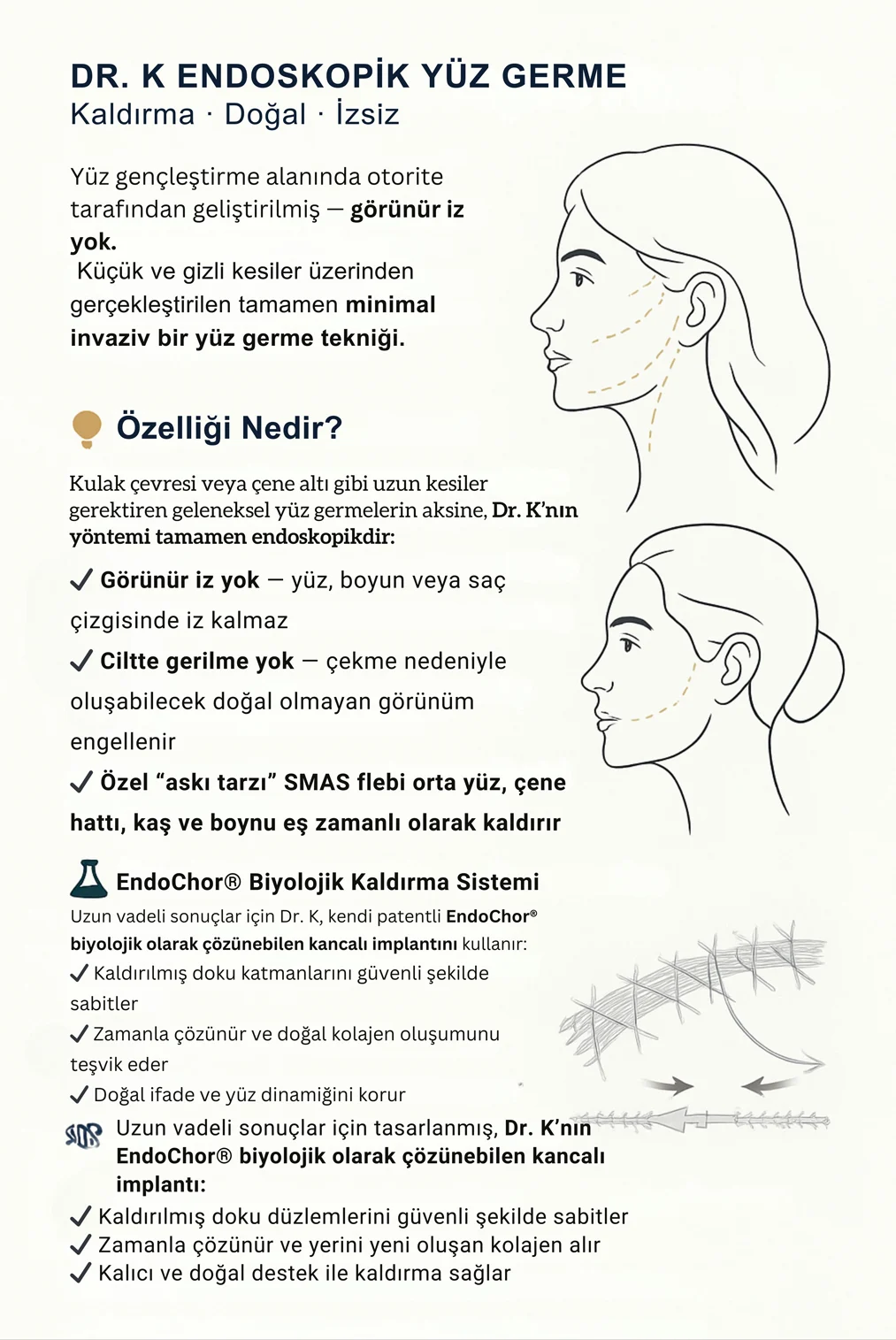 İletişim İçindekiler Daha Kalkık. Daha Doğal. İzsiz. Görünür iz bırakmadan yüz gençleştirmede yeni nesil yaklaşım.Uluslararası tanınırlığa sahip plastik cerrah Prof. Dr. Mehmet Veli Karaaltın tarafından geliştirilen Endoskopik Yüz Germe, minimal invaziv bir yüz germe tekniğidir. Bu yöntem, derin yüz yapılarını saçlı deri içine gizlenen milimetrik kesilerle yeniden konumlandırır ve görünür iz bırakmaz.Bu devrim niteliğindeki yaklaşım; …