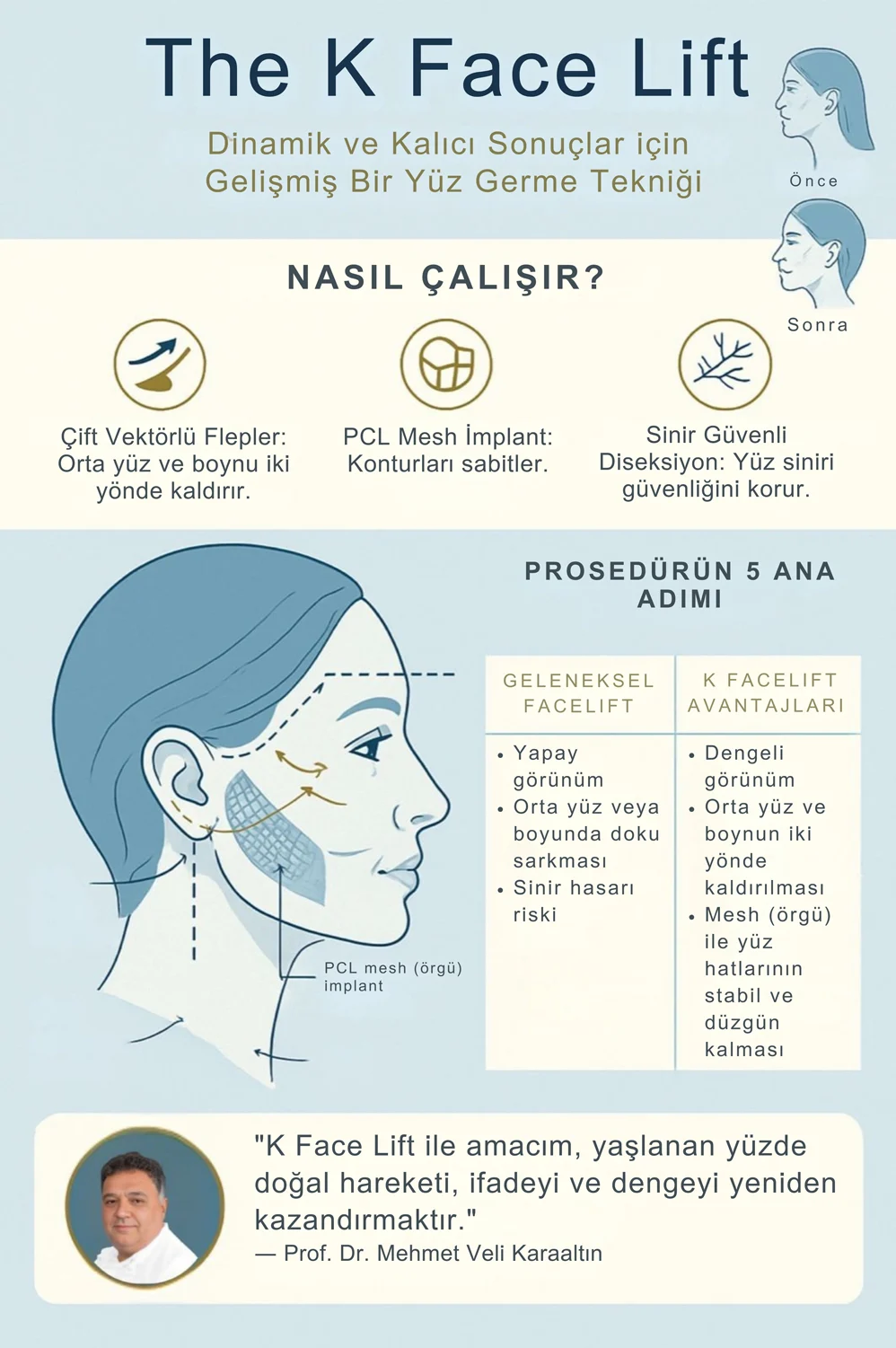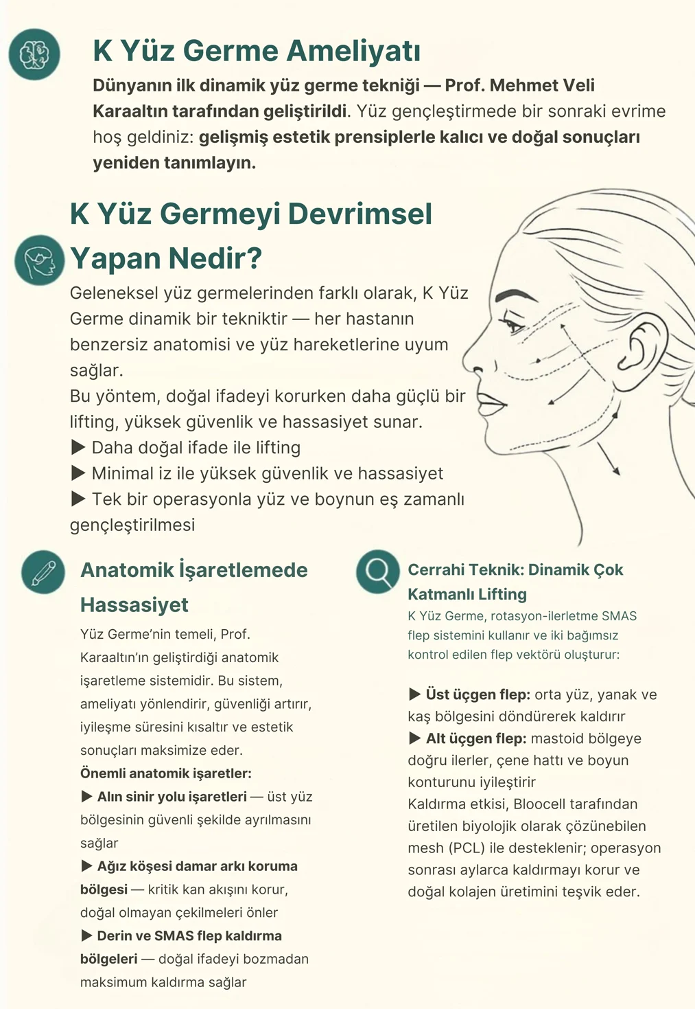 İletişim İçindekiler Dünyanın İlk Dinamik Yüz Germe Yöntemi – Prof. Dr. Karaaltin Tarafından GeliştirildiYüz gençleştirmede bir sonraki evreye hoş geldiniz. K Face Lift, yüz germe cerrahisinde sanat ve bilimi yeniden tanımlayan öncü bir tekniktir. Uluslararası alanda tanınmış Prof. Dr. Karaaltin tarafından geliştirilen bu yenilikçi yöntem, ileri düzey anatomik hassasiyet, sofistike cerrahi planlama ve dinamik doku …