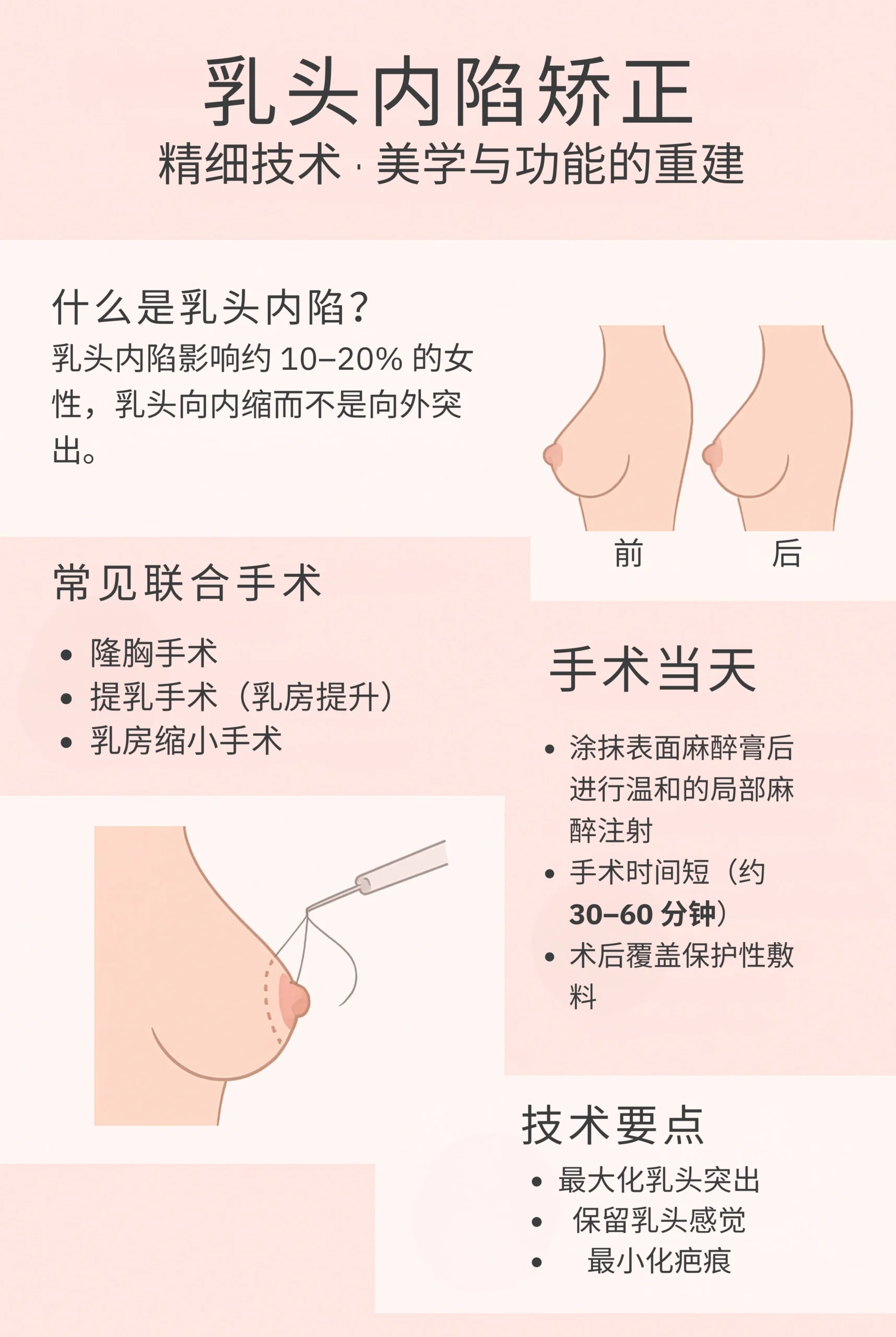 乳头内陷矫正术是一种小型外科手术,旨在解除牵拉束缚,恢复乳头自然外凸的形态。该手术可作为独立治疗实施,也可与隆胸术或乳房提升术等其他乳房整形手术联合进行。