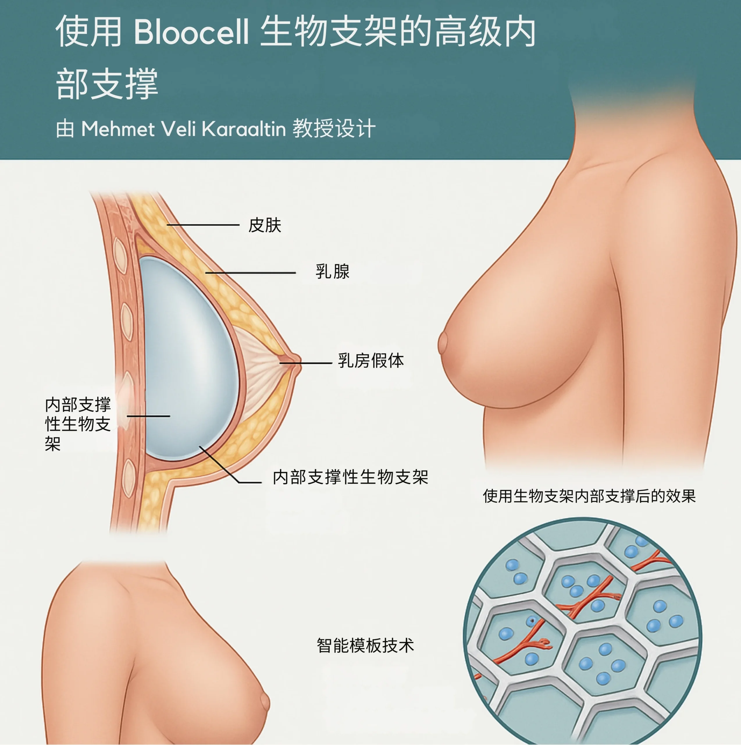 在生物技术与美容外科的交叉领域,卡拉尔廷博士与生物工程支架系统的领先创新者Bloocell Technology 合作,创建了用于乳房美容手术的新一代内部支撑基质。