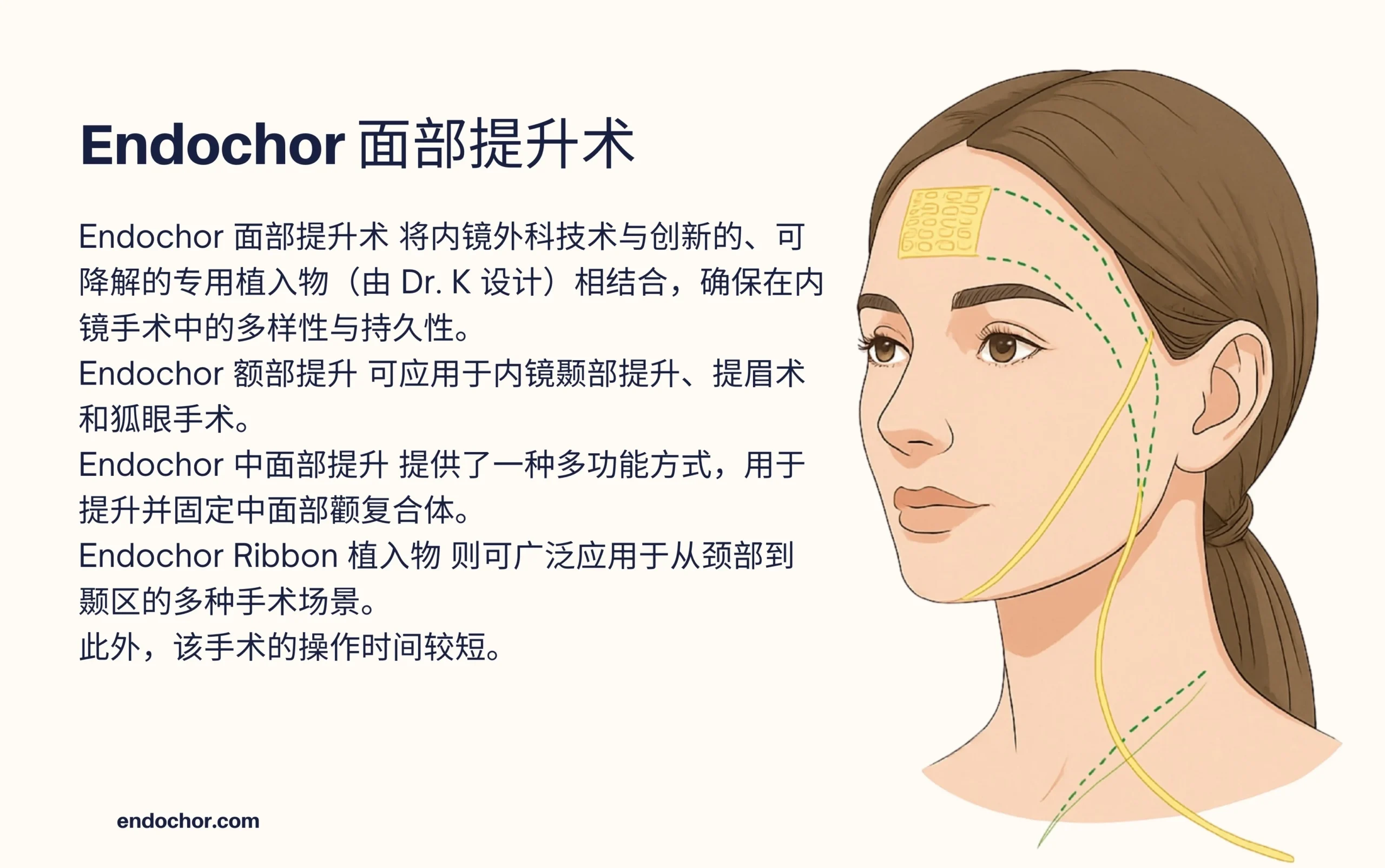 欢迎进入面部年轻化的新时代。Endochor®面部提升术是一种开创性的内窥镜面部提升系统,它将先进的微创手术技术与定制设计的生物可降解植入物相结合,可带来持久、自然的效果。